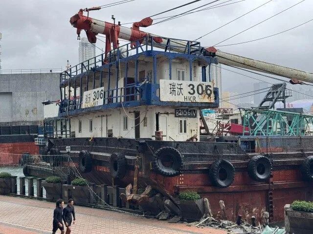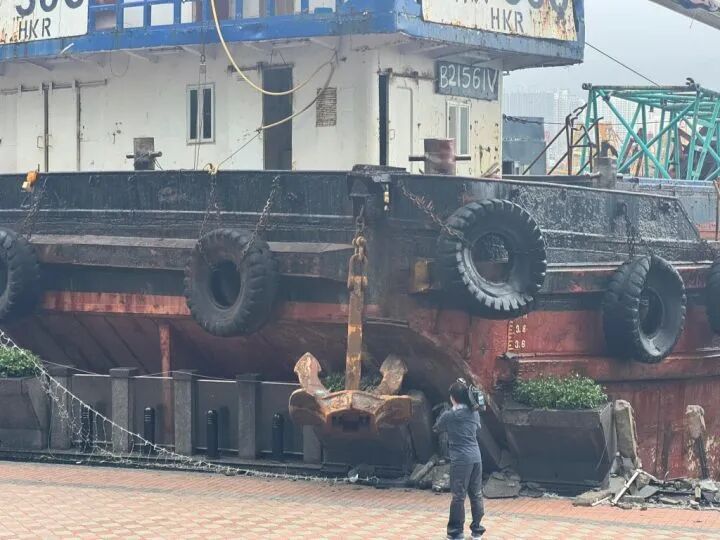在狂风巨浪下,红磡九龙海逸君绰酒店附近海面发生惊险事故。现场可见,一艘轮船在风浪猛烈下,疑似失控撞向岸边,岸边石栏严重损毁,碎片四散波及行人道。轮船撞击后船身一度紧贴岸边,船锚甩向行人道。